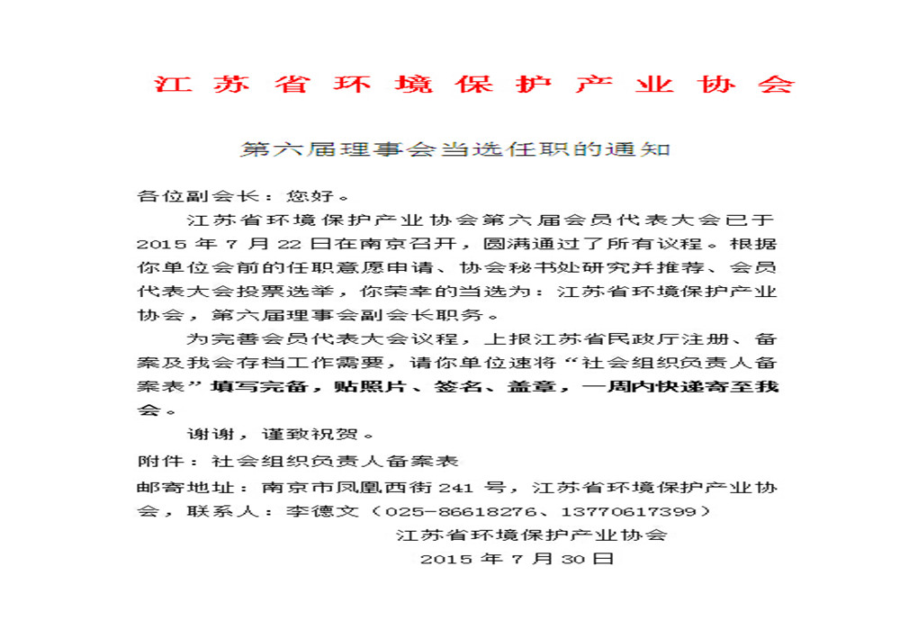 2015年7月22日,江蘇省環(huán)境保護產(chǎn)業(yè)協(xié)會第六屆會員代表大會在南京召開,根據(jù)我單位會前的任職意愿申請、協(xié)會秘書處研究并推薦、會員代表大會投票選舉,我單位榮幸的當選為:江蘇省環(huán)境保護產(chǎn)業(yè)協(xié)會,第六屆理事會副會長職務。