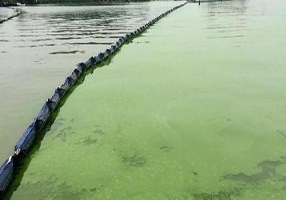 以上三張圖非常直觀的說明了在過去。藍(lán)藻的打撈一直是個大問題。那么如今科技飛速發(fā)展,藍(lán)藻治理技術(shù)已經(jīng)升級為一種完善的技術(shù)體系。首先從藍(lán)藻的區(qū)域分割來看:以前分割的方法都是用泥建壩這會導(dǎo)致什么問題。第一:壩的高度和水位的高度不一致。第二:工程性質(zhì)耗時大。那么現(xiàn)在我們用什么來分割的呢?看以下圖片:
