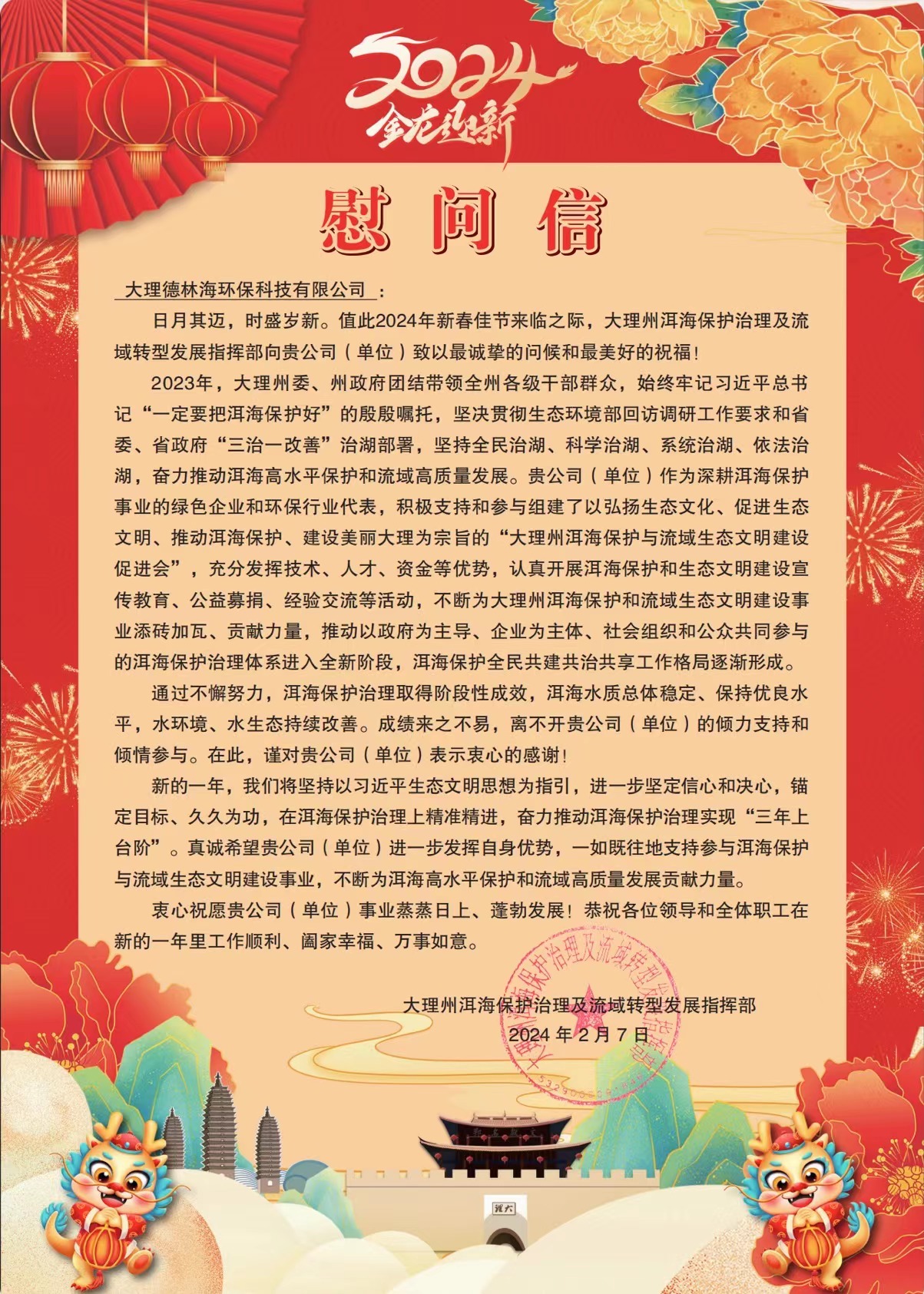 新春佳節之際,收獲這封慰問信,是對德林海既往工作成果的肯定,也是對德林海在新一年環境保護事業中銳意進取的激勵。新的一年,德林海必將錨定目標,行穩致遠。