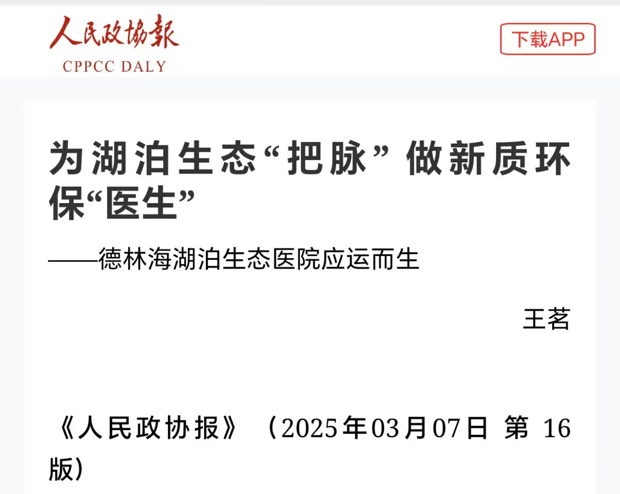 德林海湖泊生態醫院兩會期間登上央媒——《人民政協報》盛贊新質環?!搬t生”