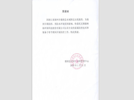 近日,我司收到了一封來自浙江省湖州市德清縣對河口水庫管理中心的致謝信。感謝我司在今年特殊的春節(jié)期間開展的藍藻防控工作。