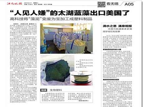 (2015年6月18日)無錫藍藻資源化利用又走出一條新路。無錫德林海藻水分離技術發展有限公司已研制出將藻泥制成含水率10%以下的藻粉技術,這些藻粉可制成生物塑料,目前已接到一家美國企業1400噸的訂單。