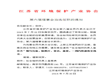 2015年7月22日,江蘇省環境保護產業協會第六屆會員代表大會在南京召開,根據我單位會前的任職意愿申請、協會秘書處研究并推薦、會員代表大會投票選舉,我單位榮幸的當選為:江蘇省環境保護產業協會,第六屆理事會副會長職務。